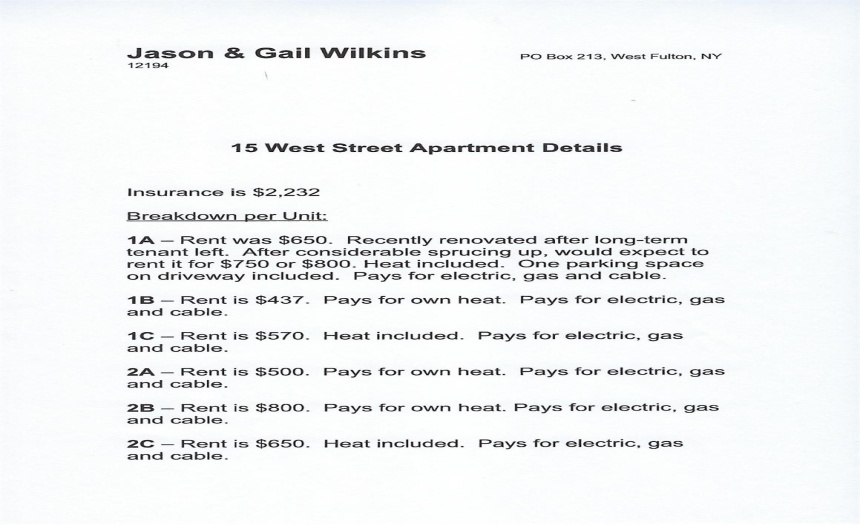 Properties Pictures Google Map 15 West Street4,248 Sqft - Oneonta, New York 13820 Basic Details Property Type : Multi FamilyListing Type : For SaleListing ID : 135102Price : $279,000Bedrooms : 6Rooms : 0Bathrooms : 6Square Footage : 4,248 SqftYear Built : 1920Lot Area : 0.15 Acre Features Basement : PartialRoof Deck : RubberConstruction : FrameSewer : Public SewerWater : PublicStyle : 2 Story Address Map Country : USState : NYCounty : OtsegoCity : OneontaArea : 21Zipcode : 13820Street : WestStreet Number : 15Street Suffix : StreetLongitude : W76° 56' 13.4'' Latitude : N42° 27' 12.6'' Directions : Oneonta village to Chestnut to right on West Stree Additional Information Office Name : Schoharie County Real EstateAgent Name : Scot K WentworthLease Type : NetListing Agent MLS ID : 1834Listing Office MLS ID : SCREFireplaces : 0Garage Spaces : 2Garage Type : AttachedHeat/Cool Type : Baseboard Heat,Electric Heat,Hot Water Heat,Oil HeInterior Features : High Speed CableExterior Features : PorchFlooring : Carpet, VinylFoundation : StoneProperty Disclosure : NoTown/CountyTax : $793School District : OneontaStatus : ActiveAssociation : Otsego-DelawareDays On Market : 3Assessment : 160000.00 Multi Family For Sale Listing ID : 135102 Bedrooms : 6 Bathrooms : 6 Square Footage : 4,248 Sqft $279,000 Share on Facebook PDF Add to favorites Remove from favorites Send to Friend Request a Visit Agent info Michaela Frank analytics@sweethomeproductions.com Contact Agent